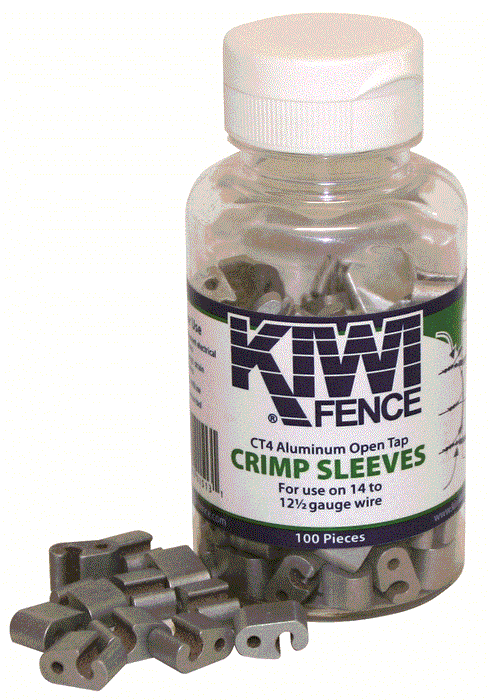 The open tap crimp sleeve is ideal for making permanent electrical connections on 12½ and 14 gauge wire. Do not use for connections requiring strength. The advantage is the open side which allows for installation onto existing high-tensile wire fence. A crimping tool is normally used to compress the open tap sleeve. Use the slot marked 3-4. (Consider the Split Bolt Line Tap (CBT) for removable connections.)