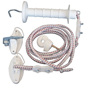 This kit comes with a spring gate that stretches up to 24'. It comes with 2 wood post pinlock insulators, 3-hole gate plate, & gate handle.